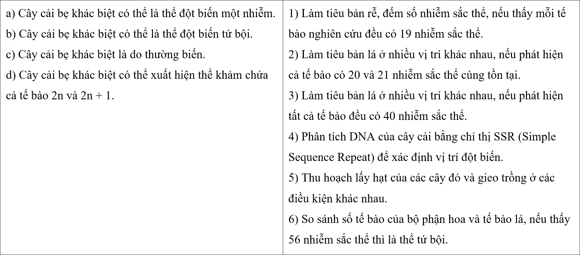 Loài cải bẹ (Brassica rapa subsp. chinensis) có bộ nhiễm sắc thể lưỡng bội 2n = 20. Một nhóm học sinh khi quan sát ruộng trồng cải bẹ phát hiện một số cây có đặc điểm khác biệt rõ rệt về sinh trưởng, hình thái lá và khả năng ra hoa, từ đó đưa ra nhận định và đề xuất phương pháp kiểm chứng.
