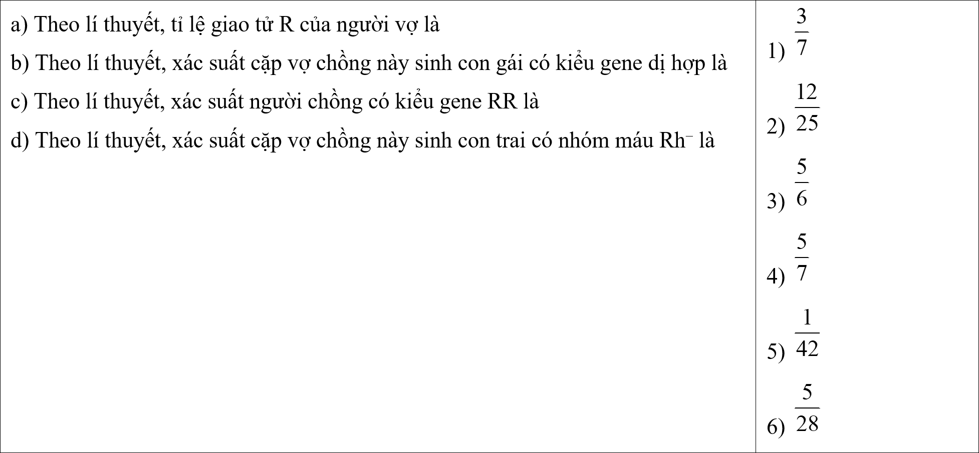 Tỉ lệ người có nhóm máu Rh⁻ là 16% ở người da trắng và 4% ở người da vàng. Một người đàn ông da trắng kết hôn với một người phụ nữ da vàng, cả hai đều có nhóm máu Rh⁺ và khả năng sinh sản bình thường. Biết rằng quần thể người da trắng và da vàng nói trên đều ở trạng thái cân bằng di truyền.