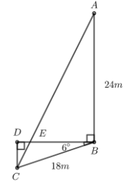 Một tháp nước được xây dựng trên một con dốc nghiêng $6^{0}$ so với phương ngang. Để tháp đứng thẳng, người ta dùng hai dây cáp cố định tháp như hình vẽ. Biết rằng tháp cao 24 m và khoảng cách từ chân tháp đến chỗ cố định dây cáp là 18 m. Hỏi dây cáp dài hơn có chiều dài bằng bao nhiêu (làm tròn kết quả đến hàng phần mười của mét)?