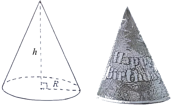 1) Một chiếc mũ sinh nhật dạng hình nón (hình vẽ minh họa bên), biết chiều cao $h = 24\, cm$, bán kính đáy $R = 10\, cm$. Hỏi diện tích xung quanh của chiếc mũ sinh nhật đó là bao nhiêu centimét vuông (lấy $\pi = 3,14$ và kết quả được làm tròn đến hàng phần mười)?