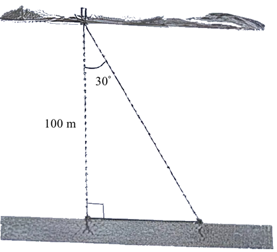 2) Hình vẽ bên minh họa một phần con sông có bề rộng $AB = 100\, cm$. Một chiếc thuyền đi thẳng từ vị trí B bên này bờ sông đến vị trí C bên kia bờ sông. Hỏi khoảng cách BC bằng bao nhiêu mét (kết quả được làm tròn đến hàng phần mười), biết $AB\bot AC$ và $\angle ABC = 30^{o}$?