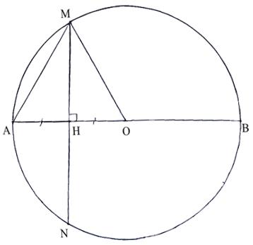 Cho đường tròn tâm $O$, đường kính $AB$. Gọi H là trung điểm của đoạn thẳng AO, dây cung MN