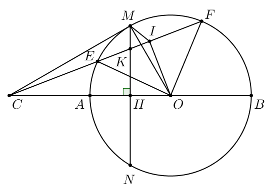2) Trên tia OA lấy điểm C sao cho A là trung điểm của đoạn thẳng OC. Qua C vẽ đường thẳng cắt đoạn thẳng MH tại K (K khác hai điểm M và H), cắt đường tròn đã cho tại hai điểm E, F (E nằm giữa C và F). Gọi I là trung điểm của đoạn thẳng EF. Chứng minh tứ giác $CMIO$ nội tiếp và $CM^{2} = CI.CK$