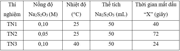 | a) So sánh TN1 và TN2 cho thấy: khi nồng độ Na₂S2O3 giảm 2 lần thì tốc độ phản ứng giảm 2 lần. | ||