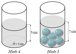 Đặt trên mặt bàn nằm ngang một cái ly thủy tinh đang chứa nước có dạng hình trụ với bán kính đáy R = 3 cm, mực nước ban đầu trong ly cao 5 cm (Hình 4). Sau đó, thả vào trong ly 6 viên bi sắt cùng loại (không thấm nước) có dạng hình cầu với bán kính r = 1 cm thì thấy mực nước trong ly dâng lên và không tràn ra ngoài (Hình 5).