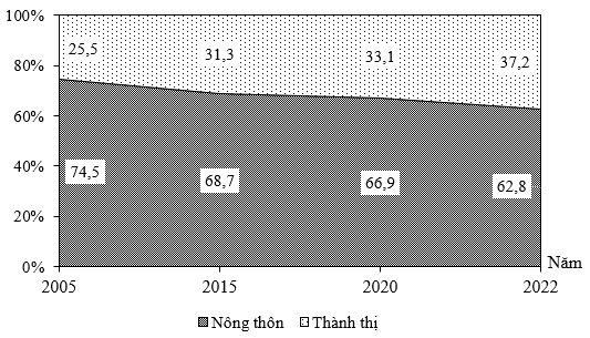 Cho biểu đồ về lực lượng lao động từ 15 tuổi trở lên phân theo khu vực thành thị và nông thôn ở nước ta giai đoạn 2005 - 2022: