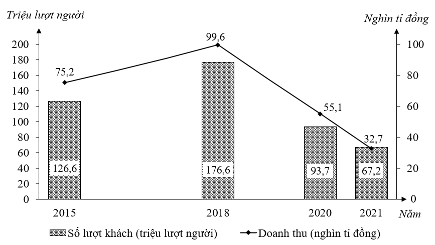 Cho biểu đồ: BIỂU ĐỒ SỐ LƯỢT KHÁCH VÀ DOANH THU DU LỊCH Ở NƯỚC TA GIAI ĐOẠN