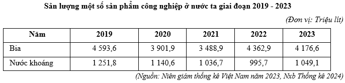 Dựa vào sản lượng bia, nước khoáng giai đoạn 2019 – 2023 và lựa chọn nhận xét đúng.