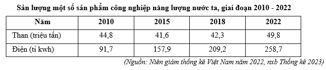 Căn cứ vào bảng số liệu trên, hãy cho biết năm 2022 so với năm 2010, tốc độ tăng trưởng của điện nhiều hơn tốc độ tăng trưởng của than bao nhiêu %? (làm tròn kết quả đến hàng đơn vị).