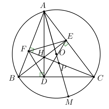 Cho tam giác nhọn ABC nội tiếp đường tròn $(O)$, với $AB \neq AC$ . Các đường cao BE và CF cắt nhau tại trực tâm H của tam giác ABC.