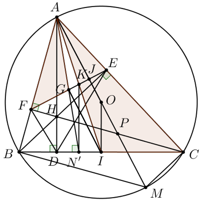 c) Gọi I là trung điểm của BC, đường thẳng AI cắt EF tại K. Gọi N là hình chiếu vuông góc của K trên BC. Chứng minh AN đi qua trung điểm của EF.