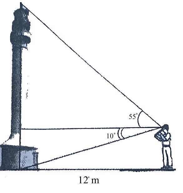 Một người quan sát đứng cách một cái tháp 12 m, nhìn thẳng đỉnh tháp và chân tháp lần lượt dưới một góc $55{^\circ}$ và $10{^\circ}$ so với phương nằm ngang (tham khảo hình vẽ). Chiều cao của tháp bằng bao nhiêu? (làm tròn kết quả đến hàng đơn vị của $m$)