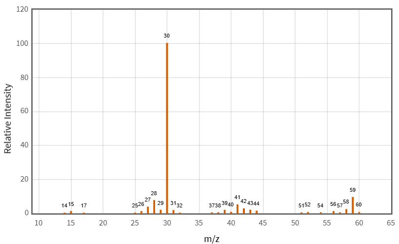 Kết quả phân tích nguyên tố cho thấy trong hợp chất X: carbon chiếm 61,02% hydrogen chiếm 15,25%; còn lại là nitrogen về khối lượng. Từ phổ khối lượng cùa X xác định được giá trị m/z cùa peak [M+] bằng 59.