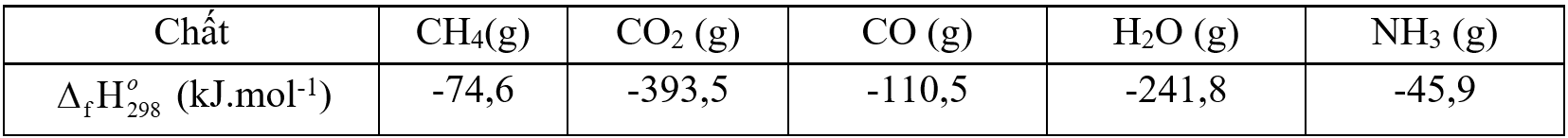 Xét các phản ứng ở điều kiện chuẩn và hiệu suất chuyển hóa của methane ờ phản úng (1) là 95%. Tính khối lượng khí methane (theo tấn, làm tròn tới hàng phần mười) cần thiết để sản xuất 3,40 tấn NH3(g) trong giai đoạn trên. Biết 80% lượng nhiệt tỏa ra từ phản ứng (2) được cung cấp cho phản ứng (1) và các giá trị nhiệt tạo thành ($\Delta_{\text{f}}\text{H}_{298}^{o}$) của các chất ở điều kiện chuẩn được cho trong bảng sau: