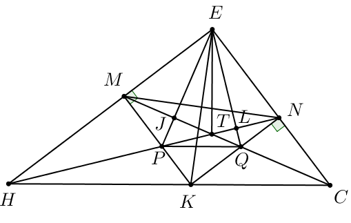 c) Tia phân giác của góc HEC cắt CH tại K. Kẻ K M, K N lần lượt vuông góc với EH, $EC(M \in EH,N \in EC)$. Hai đoạn thẳng CM và HN cắt nhau tại T. Gọi P là giao điểm của HN và KM, Q là giao điểm của CM và KN. Chứng minh ET vuông góc với PQ.
