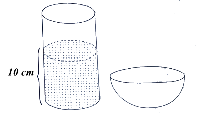 a) Một bác nông dân có một bình đựng nước chè xanh, phần chứa nước là dạng hình trụ có bán kính đáy bằng 4 cm, mực nước trong bình có chiều cao bằng 10 cm . Bác muốn đổ hết nước từ bình sang một cái bát uống nước, phần chứa nước là dạng nửa hình cầu có bán kính bằng 6 cm (hình vẽ bên). Hỏi nếu đổ như vậy thì nước có bị tràn ra ngoài hay không? Vì sao?