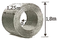 Một khối thép cuộn dạng hình trụ có các số đo như hình vẽ (đường kính trong 0,6 m; đường kính ngoài 1,8 m; khối ngang 1,25 m). Tính gần đúng khối lượng của cuộn thép biết 1 m3 có khối lượng 7850 kg.