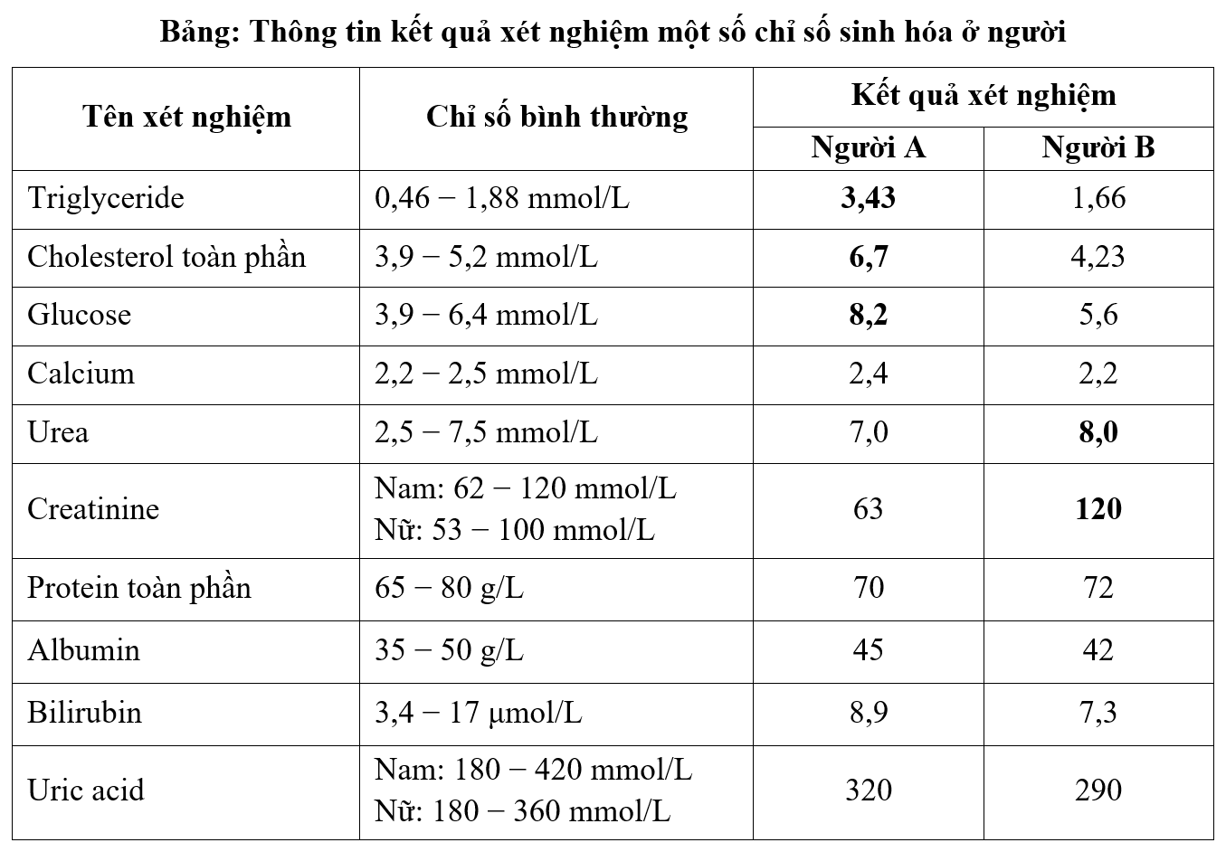 Người A và người B đi kiểm tra sức khỏe và nhận được thông báo về các chỉ số xét nghiệm như bảng sau.