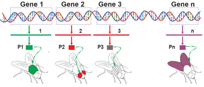 | c) P1, P2, P3 ... là các protein được tổng hợp từ gene qua phiên mã và dịch mã. | ||