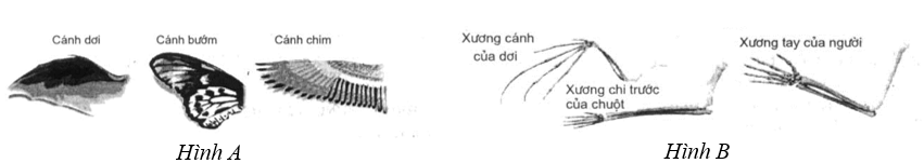 Dùng thông tin sau để trả lời 2 câu hỏi tiếp theo: Hình bên dưới minh họa sự khác biệt giữa cơ quan tương đồng và cơ quan tương tự, qua đó làm rõ cách tiến hóa định hình cấu trúc và chức năng của các loài để thích nghi với môi trường sống.