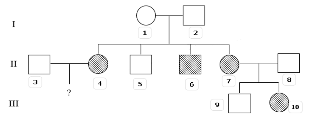 Một quần thể người đang ở trạng thái cân bằng di truyền, tần số người bị mắc một bệnh di truyền đơn gen là 9%. Phả hệ dưới đây cho thấy một số thành viên (màu đen) bị một bệnh này. Kiểu hình của người có đánh dấu (?) là chưa biết.