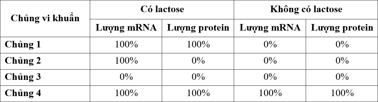 Bảng dưới đây mô tả hàm lượng mRNA và protein tương đối của gene lacZ thuộc operon lac ở các chủng vi khuẩn E. coli trong môi trường có hoặc không có lactose. Biết rằng chủng 1 là chủng bình thường các chủng 2, 3, 4 là các chủng đột biến phát sinh từ chủng 1, mỗi chủng bị đột biến ở một vị trí duy nhất trong operon lac.