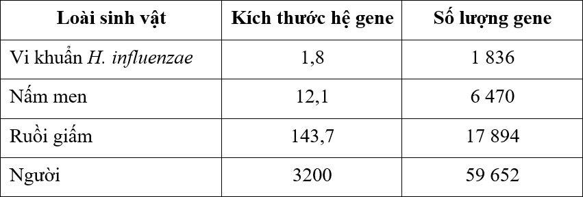 Bảng bên cho thấy kích thước hệ gene và số lượng gene trong hệ gene ở các sinh vật khác nhau.