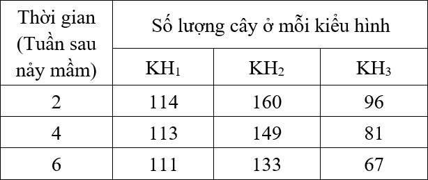 Ở 1 loài cây họ Đậu sống 1 năm, xét 1 gene có 2 allele LX và LV quy định tổng hợp sắc tố ở lá. Cây có kiểu gene LXLX, LXLV và LVLV có màu lá trưởng thành lần lượt là xanh (KH1), xanh – vàng (KH₂) và vàng – (KH3). Cây sinh sản hữu tính và giao phối ngẫu nhiên. Kết quả nghiên cứu số lượng cây sống đến 6 tuần sau nảy mầm của 3 kiểu hình ở quần thể 1 được trình bày ở bảng bên.