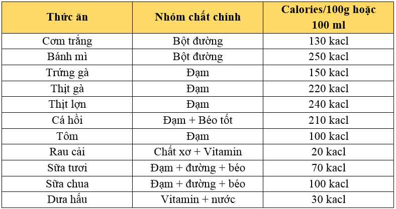 Theo khoa học, nhu cầu năng lượng trong ngày của học sinh tiểu học được tính dựa trên cân nặng, khoảng 70kcal/kg cân nặng (nghĩa là cứ 1 kg thì cần khoảng 70 kcal). Bảng dưới đây mô tả lượng calo của một số loại thực phẩm.
