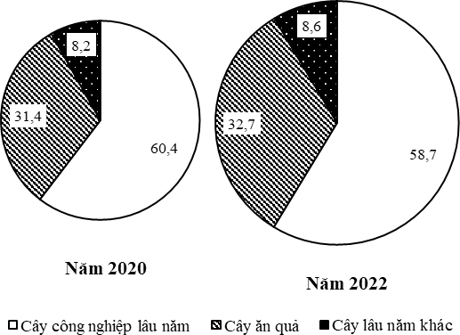 Biểu đồ cơ cấu diện tích một số cây lâu năm của nước ta năm 2020 và 2022