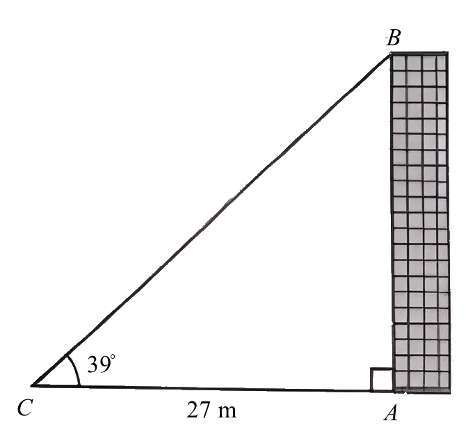 Góc tạo bởi tia nắng mặt trời chiếu qua điểm B trên nóc toà nhà với mặt đất là $39^{0}$ và bóng AC của toà nhà trên mặt đất dài 27 m (minh hoạ như hình vẽ bên dưới)
