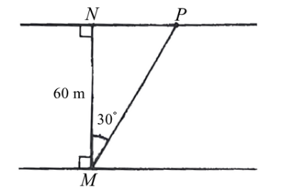 a) Một khúc sông có bề rộng $MN = 60~\text{m}$. Một người dùng thuyền máy đi thẳng từ vị trí M bên này bờ sông đến vị trí P bên kia bờ sông với góc tạo bởi phương MP và phương MN là $\angle NMP = 30^{{^\circ}}$ (như hình minh họa bên dưới). Hỏi quãng đường MP dài hơn quãng đường đi thẳng MN bao nhiêu mét (làm tròn kết quả đến hàng đơn vị của mét)?