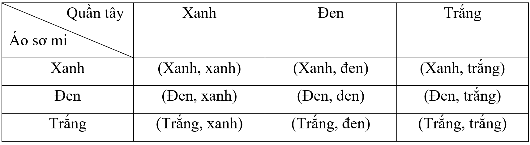 b) Trong tủ quần áo của anh An có 3 cái quần tây và 3 cái áo sơ mi. Trong đó, quần tây có 3 màu xanh, đen, trắng và áo sơ mi cũng có 3 màu xanh, đen, trắng. Anh An chọn ngẫu nhiên một bộ quần áo từ trong tủ để mặc đi dự tiệc. Tính xác suất của biến cố "Anh An chọn được một bộ quần áo cùng màu".