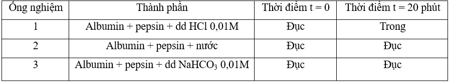 | d) Ở ống nghiệm 3, nếu thay Pepsin thành Chymotrypsin thì hiện tượng quan sát được là “từ đục thành trong” sau thí nghiệm. |