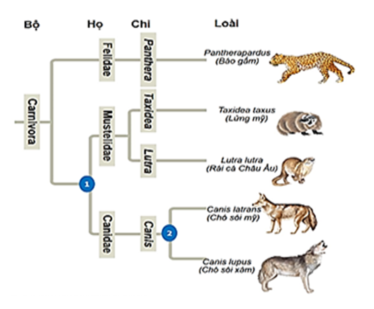 Hình dưới đây minh họa mối liên hệ giữa phân loại và phát sinh chủng loại. Phân loại theo thứ bậc được phản ảnh trên cây phát sinh phân nhánh nhỏ dần. Cây phát sinh này đánh dấu các quan hệ tiến hoá có thể giữa một số taxon trong bộ Ăn thịt (Carnivora), bản thân nó là một nhánh của lớp Thú (Mammalia). Điểm phân nhánh 1 thế hiện tổ tiên chung gần nhất của tất cả thành viên của họ Chồn (Mustellidae) với họ Chó (Canidae). Điểm phân nhánh 2 thể hiện tổ tiên chung gần nhất của chó sói Mỹ (Canis latrans) và chó sói xám (Canis lupus).