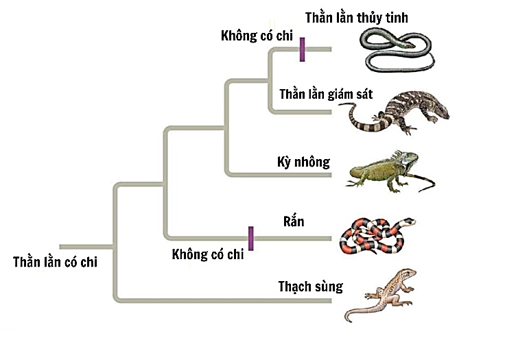 Hình bên thể hiện mối quan hệ tiến hóa giữa các loài bò sát khác nhau. Các nhánh và điểm