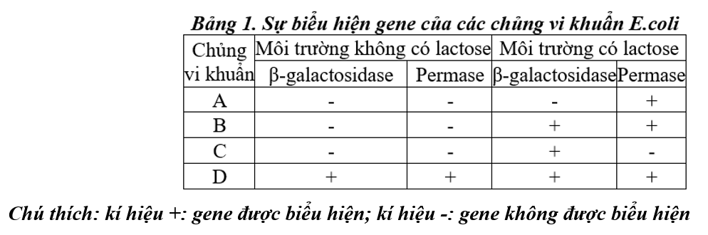 Ở vi khuẩn E.coli kiểu dại, sự biểu hiện của gene lacZ (mã hóa β-galactosidase), gene lacY (mã hóa permase) thuộc operon Lac phụ thuộc vào sự có mặt của lactose trong môi trường nuôi cấy. Bằng kỹ thuật gây đột biến nhân tạo, người ta đã tạo ra được các chủng vi khuẩn khác nhau. Nuôi cấy các chủng vi khuẩn E.coli trong hai môi trường: không có lactose và có lactose. Sự biểu hiện gene của các chủng vi khuẩn được thể hiện ở bảng sau: