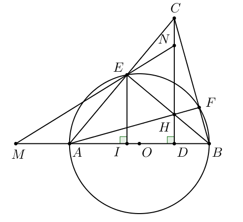 2. Cho đường tròn (O) đường kính AB bằng 2R. Gọi D là trung điểm của OB, vē đường thẳng a qua D và vuông góc với AB. Trên đường thẳng a, lấy điểm C nằm ngoài đường tròn (O). Hai đường thẳng AC, BC cắt đường tròn (O) lần lượt tại E, F (với E khác A và F khác B). Gọi H là giao điểm của AF và CD.