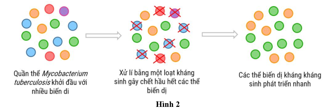 Nhận định nào dưới đây đúng khi giải thích sự hình thành chủng vi khuẩn kháng kháng sinh theo học thuyết Darwin được mô tả ở Hình 2
