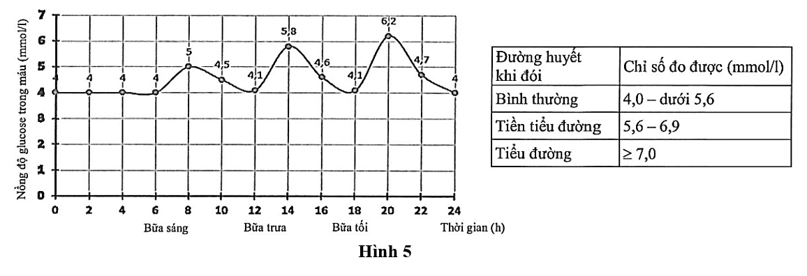 Khi tiến hành đo chỉ số đường huyết của bác X ở các thời điểm khác nhau trong ngày, các kĩ thuật viên đã thu được kết quả thể hiện qua đồ thị (Hình 5)