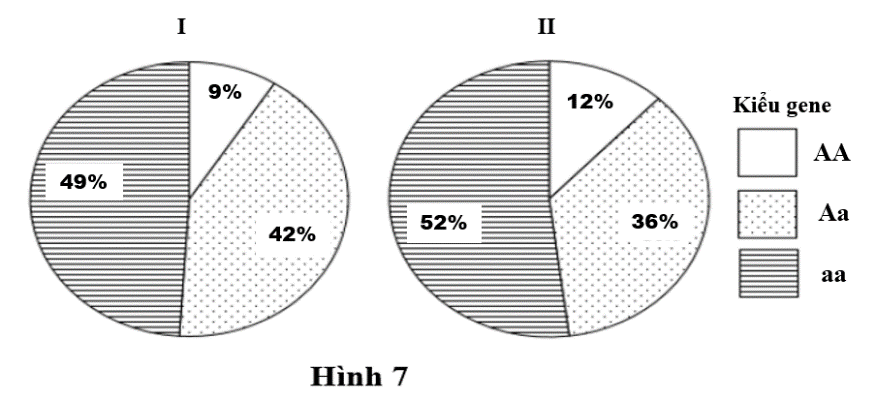 Ở thỏ, tính trạng màu sắc lông do một gene có hai allele quy định, allele A quy định lông đen trội không hoàn toàn so với allele a lông trắng, kiểu gene Aa cho kiểu hình lông xám. Nhóm nghiên cứu sinh tiến hành thống kê số lượng các cá thể của hai quần thể khác nhau thuộc một loài thì thấy số lượng cá thể của hai quần thể là như nhau nhưng tỉ lệ các kiểu gene thì khác nhau như biểu đồ Hình 7 dưới đây: