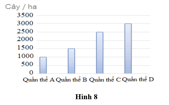 Hình 8 mô tả khu vực phân bố và mật độ của 4 quần thể cây thuộc 4 loài khác nhau trong một khu vực sống có diện tích 10 ha (tại thời điểm t). Biết diện tích phân bố của 4 quần thể A, B, C, D lần lượt là 2,5 ha; 1,2 ha; 2 ha; 1,7 ha. Quần thể có kích thước lớn nhất chênh lệch bao nhiêu cá thể so với quần thể có kích thước nhỏ nhất?