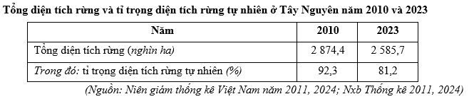 Căn cứ vào bảng số liệu, hãy cho biết diện tích rừng tự nhiên của Tây Nguyên năm 2023 so với năm 2010 giảm bao nhiêu nghìn ha (làm tròn kết quả đến hàng đơn vị).