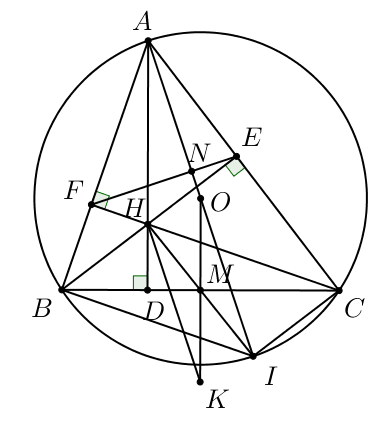2) Cho tam giác $ABC$ nhọn nội tiếp đường tròn $(O)$, các đường cao $AD,BE,CF$ của tam giác $ABC$ (với $D \in BC,E \in AC,F \in AB$) cắt nhau tại $H$.