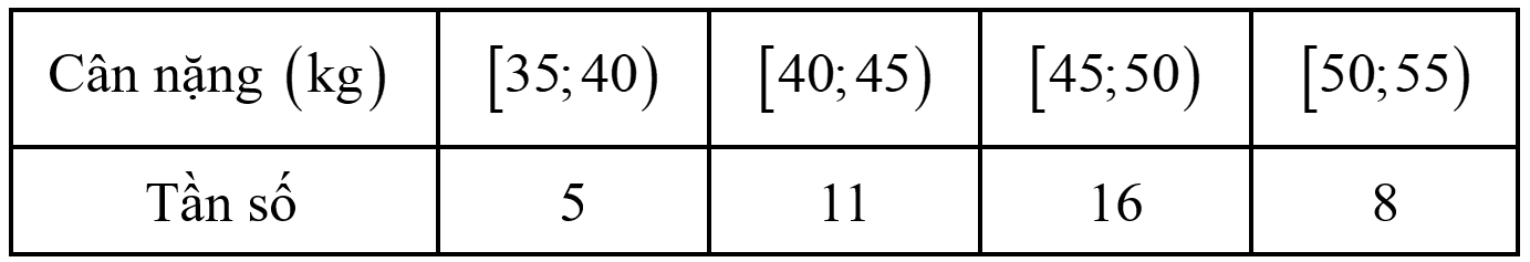 Kiểm tra cân nặng (đơn vị: kg) của 40 bạn học sinh trong lớp, ta thu được mẫu số liệu ghép