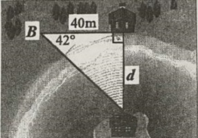1) Để tìm khoảng cách d từ một ngôi nhà trên bờ sông đến một ngôi nhà trên đảo, người ta khảo sát đo từ ngôi nhà trên bờ đến điểm B là 40 m, sau đó sử dụng dụng cụ đo để xác định số đo góc $\angle B = 42^{o}$ (tham khảo hình bên). Tính khoảng cách d (kết quả làm tròn đến hàng đơn vị)