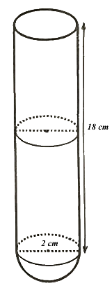 2) Một ống nghiệm gồm phần thân là hình trụ có chiều cao 18 cm và đáy là nửa hình cầu có đường kính 2 cm (tham khảo hình bên). Để tiến hành thí nghiệm đảm bảo an toàn, người ta khuyến cáo lượng hoá chất không được vượt quá một nửa phần thân ống nghiệm (kết quả mỗi ý sau làm tròn đến hàng phần mười, đơn vị là cm3 lấy $\pi = 3,14$)