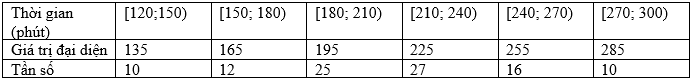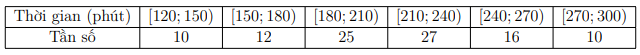 Bảng sau thể hiện mẫu số liệu ghép nhóm về thời gian dùng mạng xã hội trong một ngày của 100 người có độ tuổi từ 18 đến 25 (đơn vị là phút).