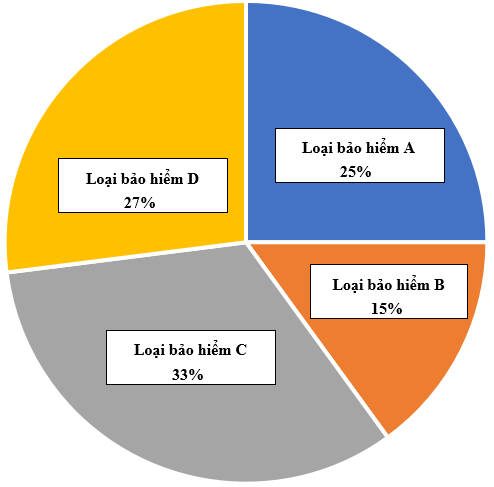 Biểu đồ tròn cho biết tỉ lệ về số lượng các loại bảo hiểm đã bán được trong tháng 4/2025 của một công ty. Biết rằng trong thang này, công ty đã bán được 300 gói bảo hiểm các loại cho 300 khách hàng khác nhau.