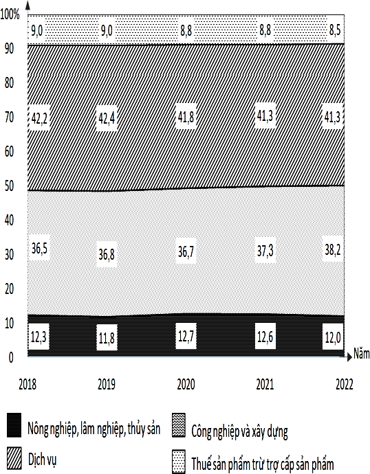Dựa vào tỉ trọng GDP của các ngành kinh tế giai đoạn 2018 – 2022 trên biểu đồ và lựa chọn nhận xét đúng.